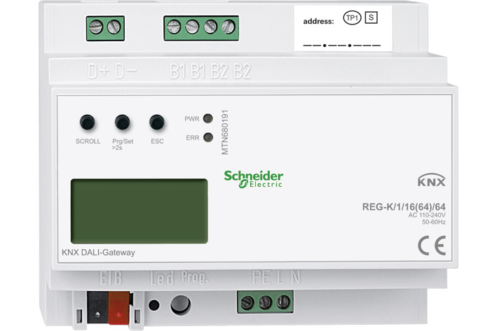The DALI gateway connects the KNX with digital electronic ballasts equipped with a DALI interface. The gateway is the DALI master and power supply for the electronic ballasts. It supports the switching and dimming of up to 64 electronic ballasts in 16 groups and the control of 16 lightscenes. In addition, the 64 electronic ballasts can be individually activated via KNX or compiled via KNX group addresses.