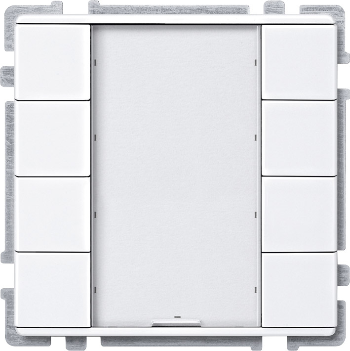 With integrated bus coupling unit. Push-button with eight operating buttons, operating display, eight blue status displays which can be triggered separately, and a labeling field. The blue operating display can also be used as an orientation sign. The lower labeling field can be parameterised as an additional operating key. The push-buttons are freely parameterisable as push-button pairs (dual-surface) or as single push buttons. The device is connected to the bus line with a bus connecting terminal.