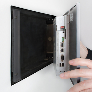 16" TFT horizontal, 1366x768, 220 cd/m², AMD Fusion T56N, 2x 1.65 GHz, 2 GB RAM, 0 GB or 8 GB flash soldered, with fan (temporary connection), dual gigabit ethernet, 2x USB2.0, 1x RS-232, audio (Line-Out), SD Card socket, KNX (optional) , PreVision-Control, Glastouch/Multitouch, POWER INPUT: 24VDC-100W