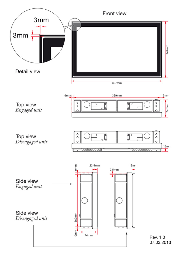 mura16W-GT 16" TFT horizontal, 1366x768, 220 cd/m², AMD Fusion T56N, 2x 1.65 GHz, 2 GB RAM, 0 GB or 8 GB flash soldered, with fan (temporary connection), dual gigabit ethernet, 2x USB2.0, 1x RS-232, audio (Line-Out), SD Card socket, KNX (optional) , PreVision-Control, Glastouch/Multitouch, POWER INPUT: 24VDC-100W